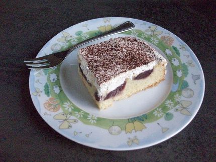 Sahne steif schlagen. Schmand unterheben und die Masse auf dem erkalteten Kuchen verstreichen. Mit Kakaopulver bestreuen.